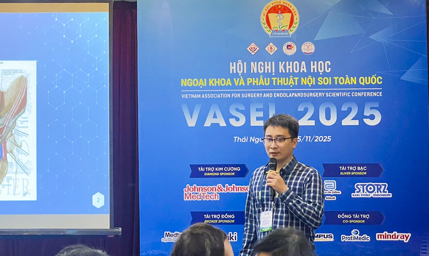 Đoàn công tác Trường Đại học Y Dược Thái Bình do TTƯT.TS Phan Văn Cương - Trưởng Bộ môn Ngoại cùng các cán bộ Bộ môn tham dự hội nghị. Tại diễn đàn, ThS.BSNT Phạm Tuấn Đạt báo cáo: “Kết quả phẫu thuật nội soi qua phúc mạc (TAPP) điều trị thoát vị bẹn tại Bệnh viện Đa khoa Thái Bình”. Báo cáo đã nhận được nhiều phản hồi tích cực và thảo luận chuyên sâu với các chuyên gia đến từ các trung tâm lớn.
