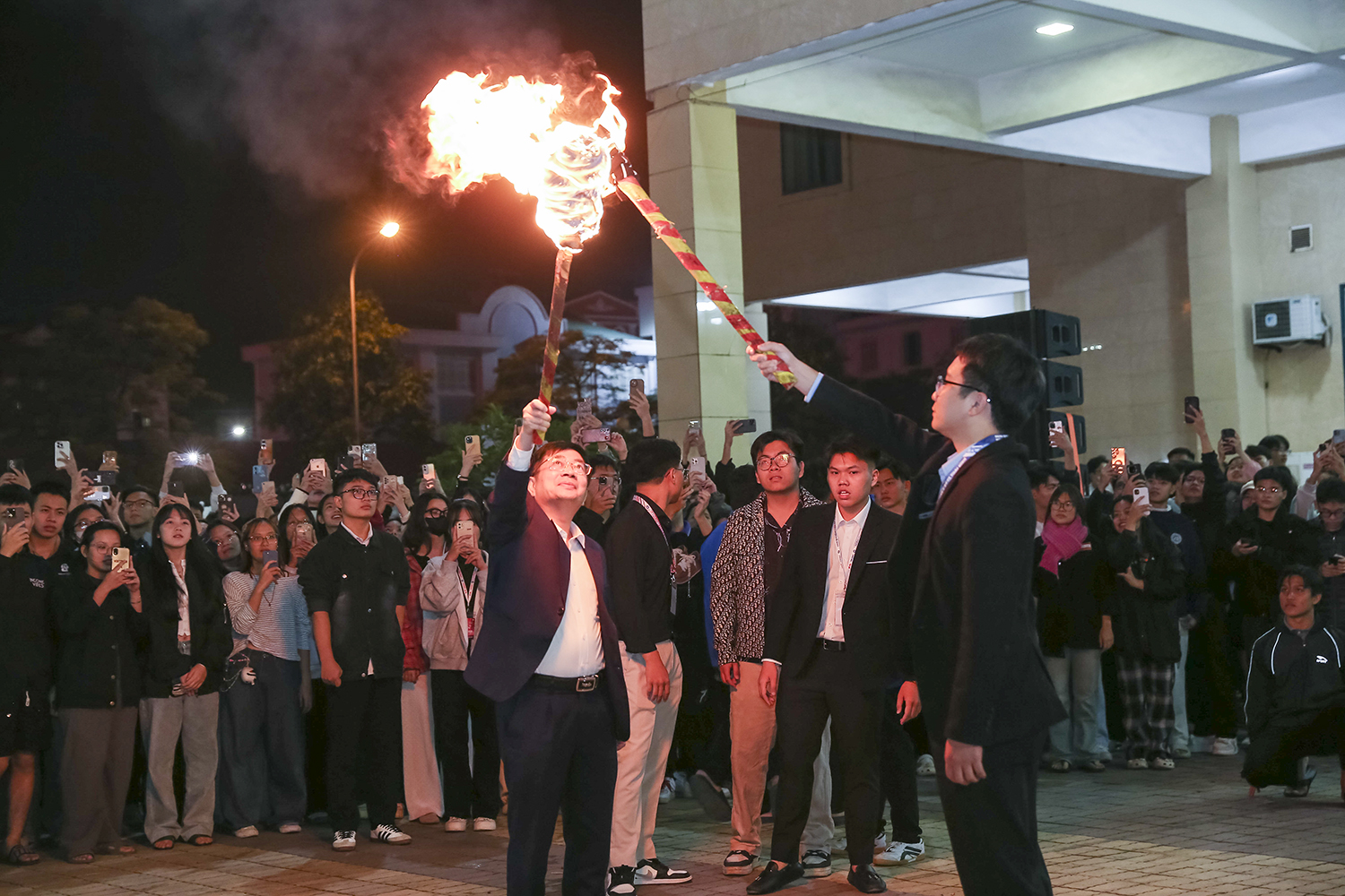 PGS.TS Nguyễn Thanh Bình, ThS.BSNT Phạm Tuấn Đạt thắp lửa hội trại truyền thống