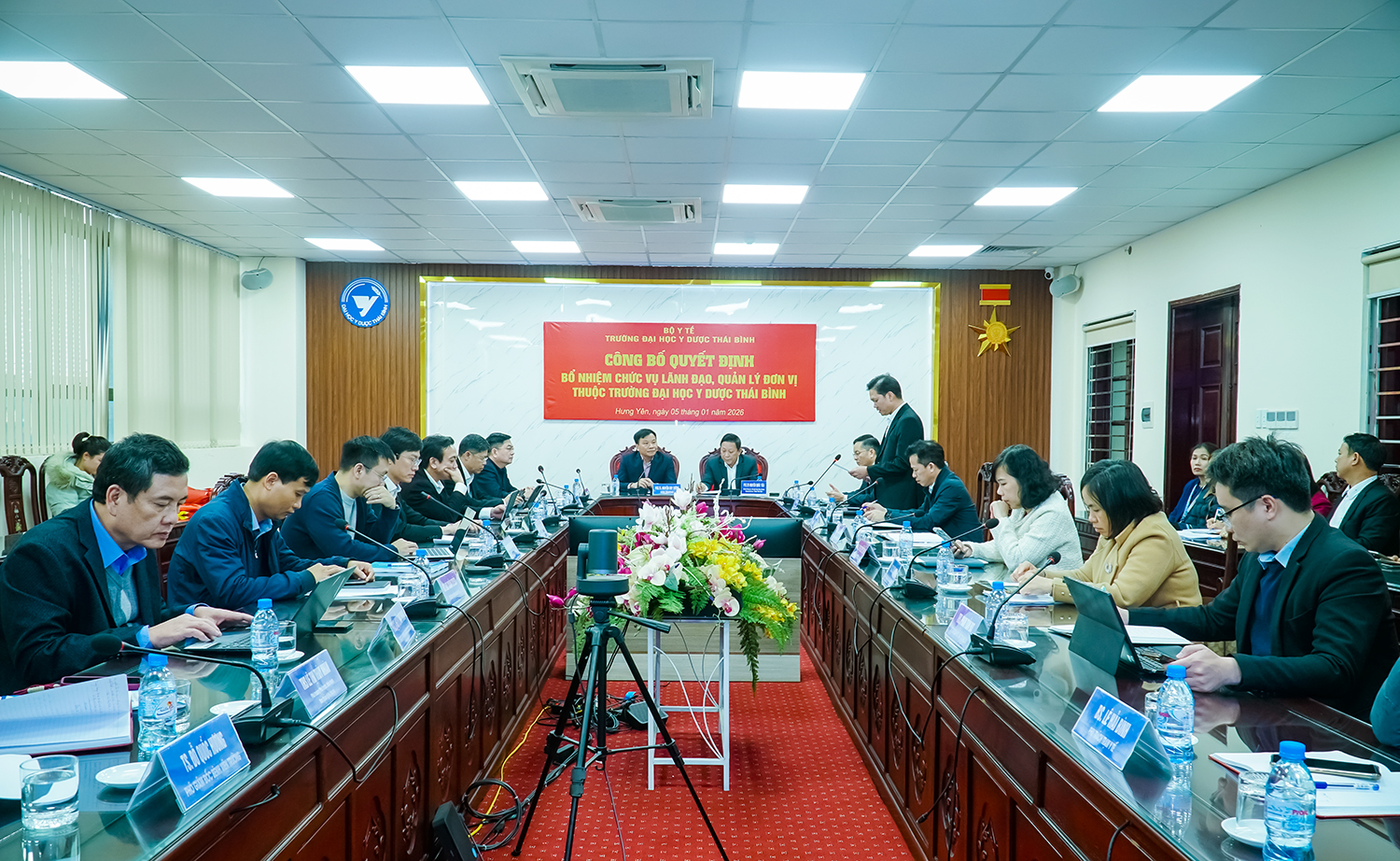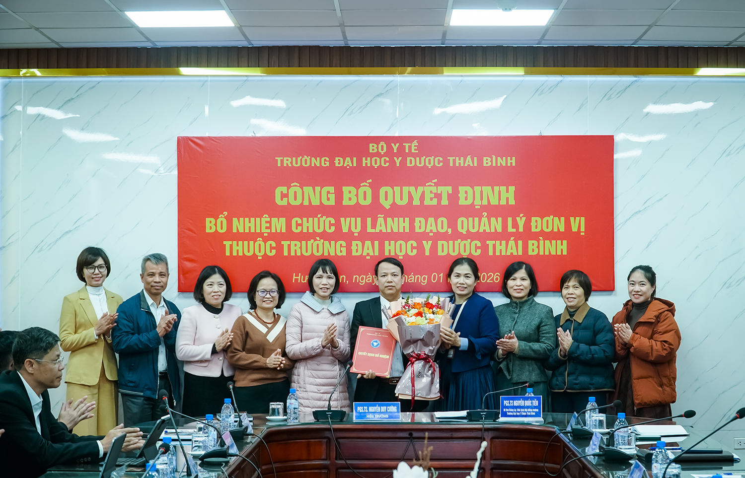 Ngày 05/01/2026, tại cuộc họp giao ban cán bộ lãnh đạo, quản lý đơn vị, TS Nguyễn Thế Điệp - Phó Hiệu trưởng, Trưởng phòng Tổ chức cán bộ đã công bố Quyết định số 2660/QĐ-YDTB, bổ nhiệm TS Vũ Duy Tùng - Giảng viên chính, Phụ trách Khoa Khoa học Y sinh giữ chức vụ Trưởng Khoa Khoa học Y sinh, Trường Đại học Y Dược Thái Bình.