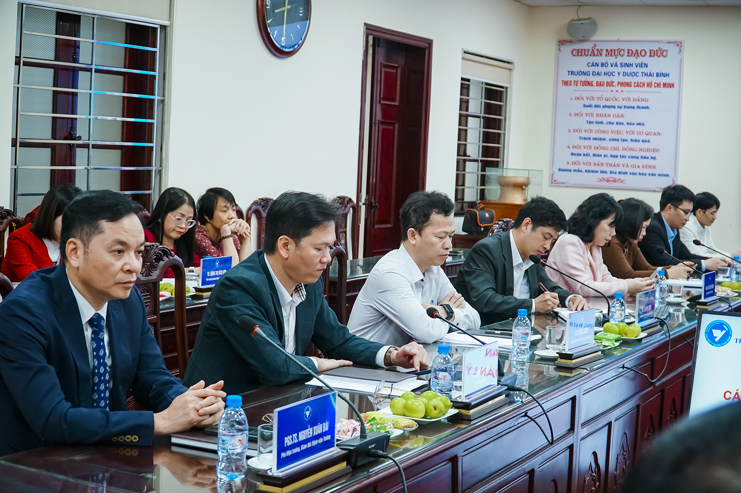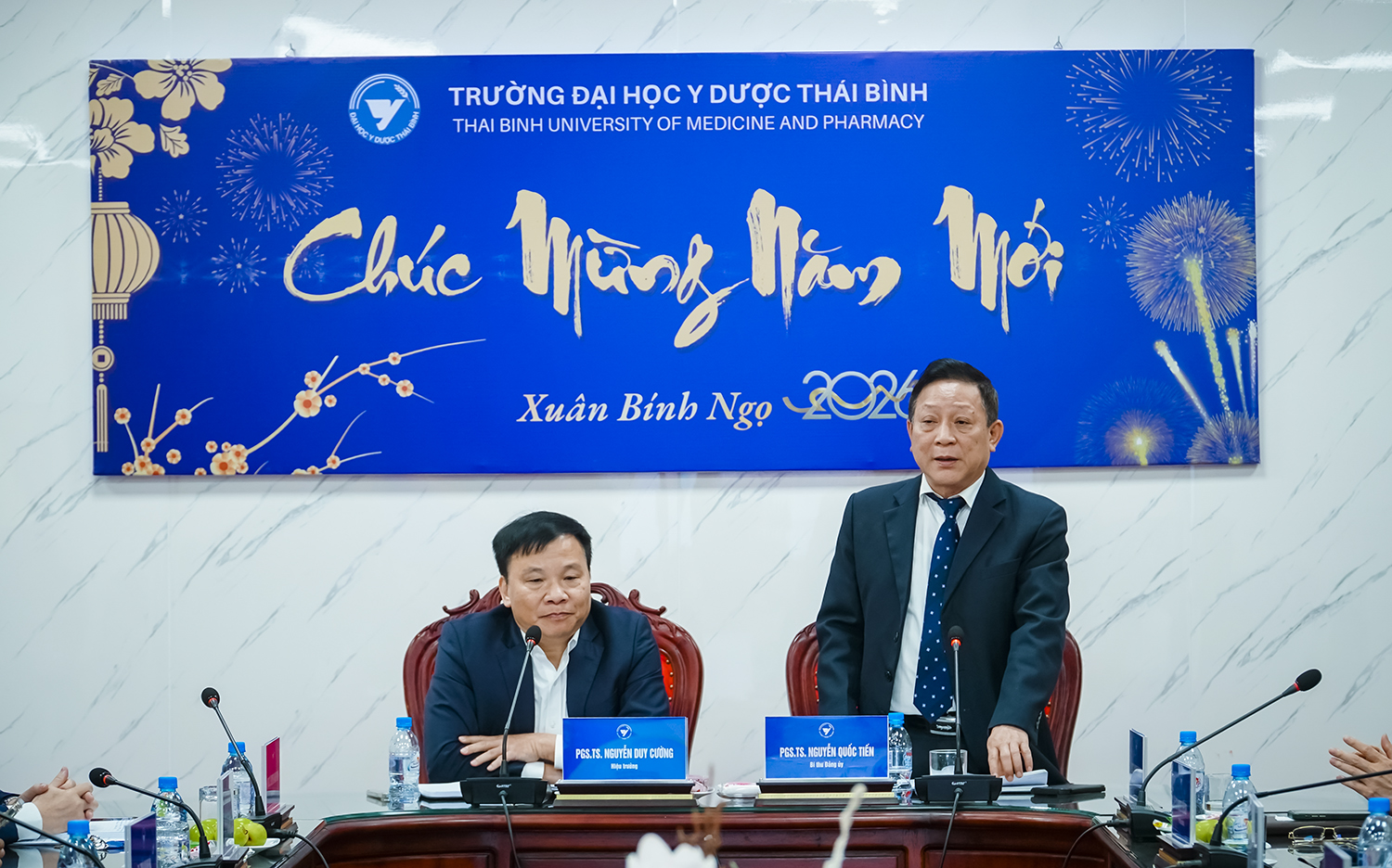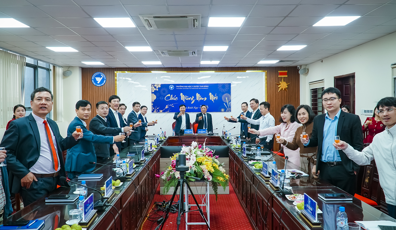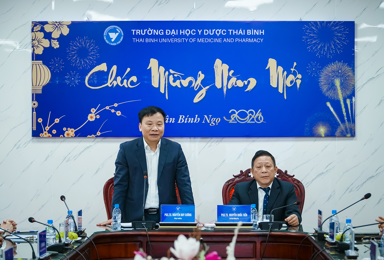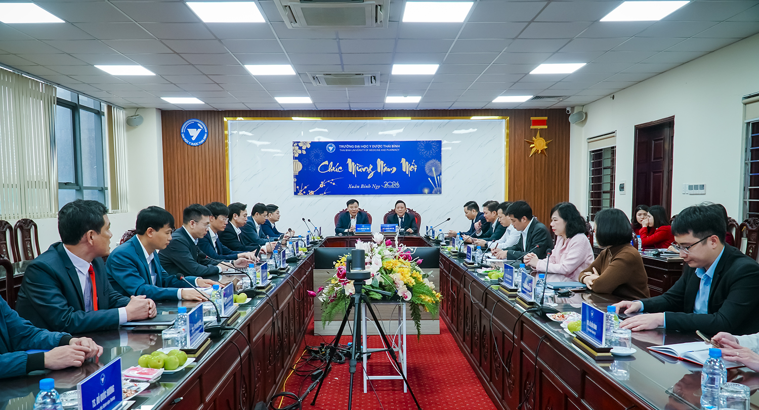 Sáng ngày 23/02/2026 (ngày mùng 07 tháng giêng năm Bính Ngọ), Trường Đai học Y Dược Thái Bình tổ chức giao ban cán bộ quản lý và gặp mặt đầu xuân năm Bính Ngọ 2026. Tham dự chương trình có PGS.TS Nguyễn Quốc Tiến – Bí thư Đảng ủy, PGS.TS Nguyễn Duy Cường – Hiệu trường; các đồng chí trong Đảng ủy, Ban Giám hiệu; cùng các đồng chí là trưởng, phó trưởng (phụ trách) các phòng ban, đơn vị Nhà trường.
