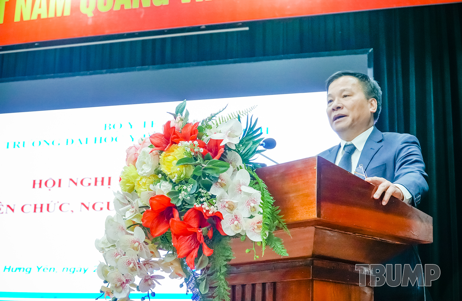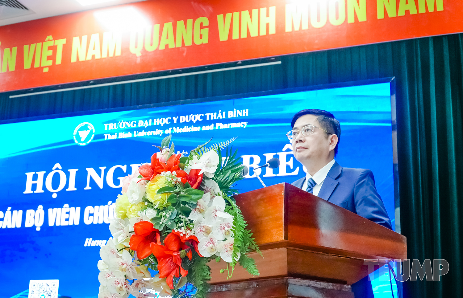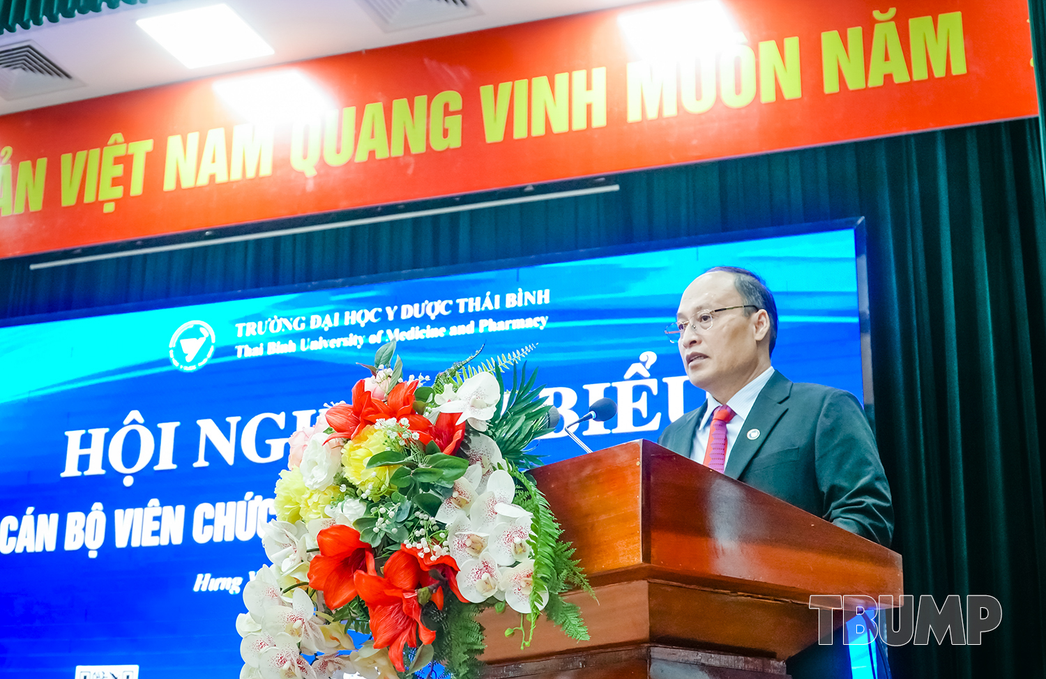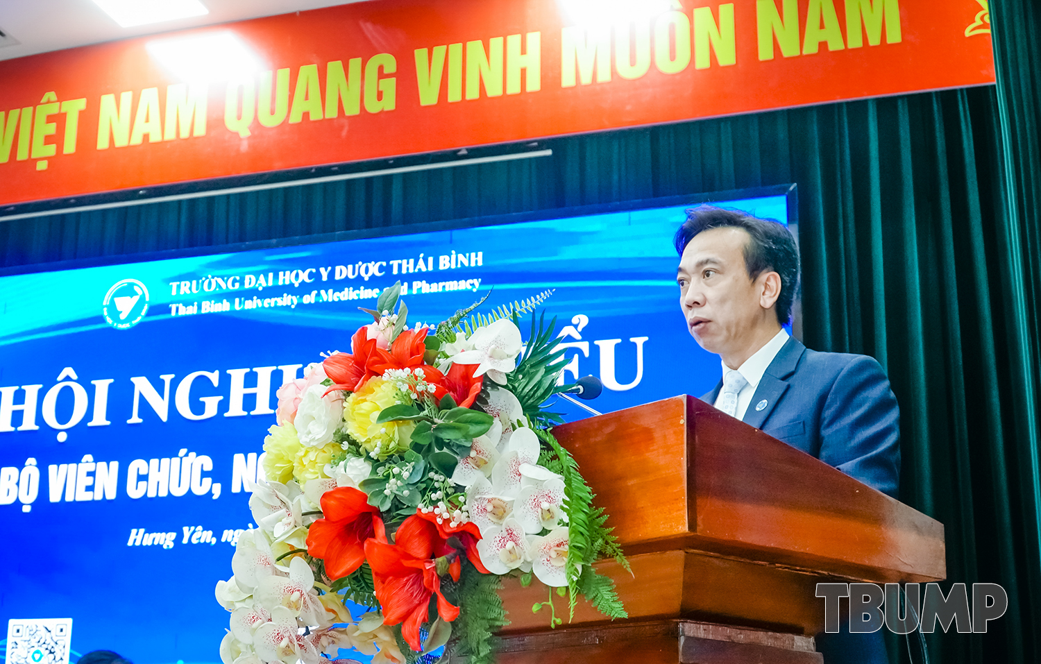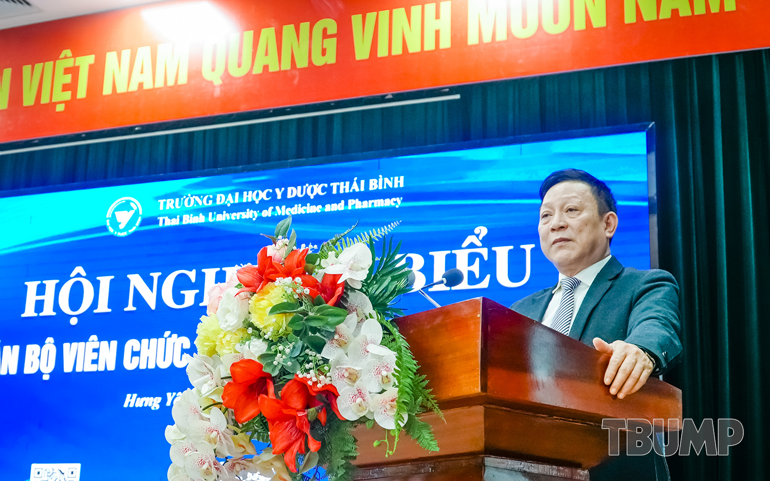 Phát biểu tổng kết Hội nghị, PGS.TS Nguyễn Duy Cường - Hiệu trưởng Nhà trường ghi nhận và biểu dương tinh thần nỗ lực, trách nhiệm của toàn thể CBVC trong năm học vừa qua. PGS, Hiệu trưởng Nhà trường nhấn mạnh: với sự đoàn kết, chủ động, sáng tạo của tập thể Nhà trường, cùng sự lãnh đạo, chỉ đạo của Đảng ủy và Hội đồng trường, Trường Đại học Y Dược Thái Bình chắc chắn sẽ hoàn thành thắng lợi nhiệm vụ năm học 2025-2026, tiếp tục khẳng định vị thế là một trong những cơ sở đào tạo, nghiên cứu y dược hàng đầu của cả nước.