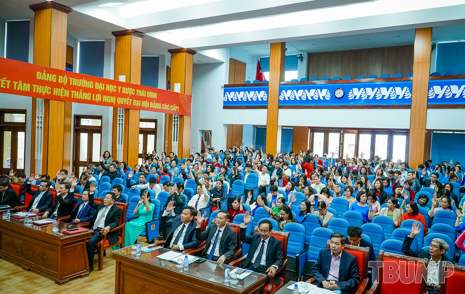 Sau thời gian làm việc nghiêm túc, dân chủ và hiệu quả, Hội nghị đại biểu cán bộ viên chức, người lao động Trường Đại học Y Dược Thái Bình năm 2025 đã thành công tốt đẹp, với 100% đại biểu biểu quyết thông qua Nghị quyết Hội nghị. Đây sẽ là kim chỉ nam để toàn Trường triển khai thực hiện hiệu quả kế hoạch năm học 2025-2026, hướng tới mục tiêu phát triển bền vững, đổi mới toàn diện và nâng cao chất lượng đào tạo, nghiên cứu khoa học, hợp tác quốc tế và chăm sóc sức khỏe nhân dân.