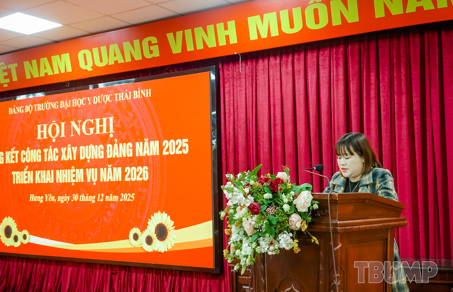 Phát biểu tại Hội nghị, đồng chí Trần Thị Nụ - Phó Bí thư chuyên trách Đảng bộ UBND tỉnh đánh giá cao kết quả thực hiện công tác xây dựng Đảng năm 2025 của Đảng bộ Nhà trường, ghi nhận sự nỗ lực, cố gắng của tập thể Đảng ủy trong công tác lãnh đạo, chỉ đạo, điều hành và tổ chức triển khai thực hiện có hiệu quả các mục tiêu Nghị quyết đề ra. Đặc biệt là công tác tổ chức Đại hội Đảng bộ Trường khóa XXV, nhiệm kỳ 2025 - 2030. Với những nỗ lực cố gắng của toàn thể cán bộ, đảng viên và học viên, sinh viên, Đảng ủy Trường Đại học Y Dược Thái Bình đã vinh dự được Đảng bộ UBND tỉnh trao "Đảng ủy hoàn thành xuất sắc nhiệm vụ" năm 2025. Đây là kết quả của tinh thần đoàn kết, quyết tâm của toàn Đảng bộ, đặc biệt là sự chỉ đạo sát sao, mạnh mẽ của các cấp ủy Đảng mà trực tiếp là đồng chí Bí thư Đảng ủy. Thay mặt lãnh đạo Đảng bộ UBND tỉnh, đồng chí đề nghị, trong thời gian tới Đảng bộ Nhà trường cần tiếp tục tăng cường công tác giáo dục chính trị tư tưởng; phát huy sức mạnh tập thể để lãnh đạo thực hiện xuất sắc nhiệm vụ chính trị năm 2026, thực hiện thắng lợi Nghị quyết Đại hội lần thứ XXV của Đảng bộ cũng như Chương trình làm việc toàn khoá nhiệm kỳ 2025 - 2030; thi đua lập thành tích xuất sắc chào mừng Đại hội đại biểu toàn quốc lần thứ XIV của Đảng.