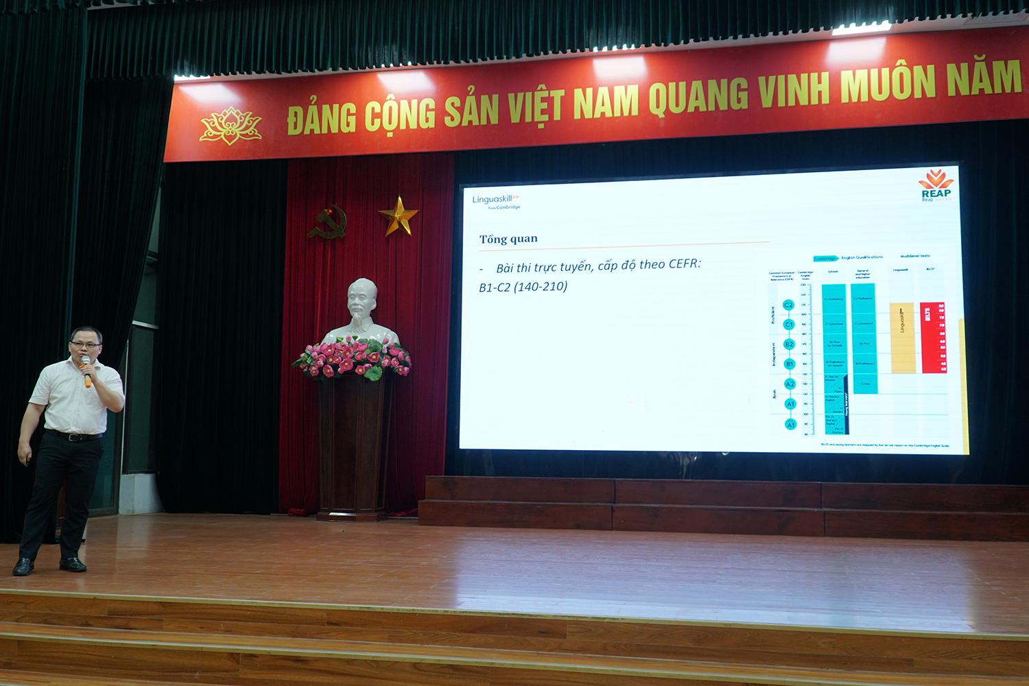 Hội thảo đã nghe ông Nguyễn Long Hưng - Giám đốc Công ty Cổ phần Nghiên cứu, Ứng dụng và Thực nghiệm Công nghệ REAP giới thiệu tổng quan về chứng chỉ tiếng Anh Linguaskill, giá trị sử dụng, cấu trúc bài thi, hình thức thi, cách đăng ký thi và cách thức đánh giá kết quả. Đồng thời, trực tiếp giải đáp thắc mắc liên quan đến bài thi; trao đổi kinh nghiệm làm bài và chiến lược đạt B1/B2.