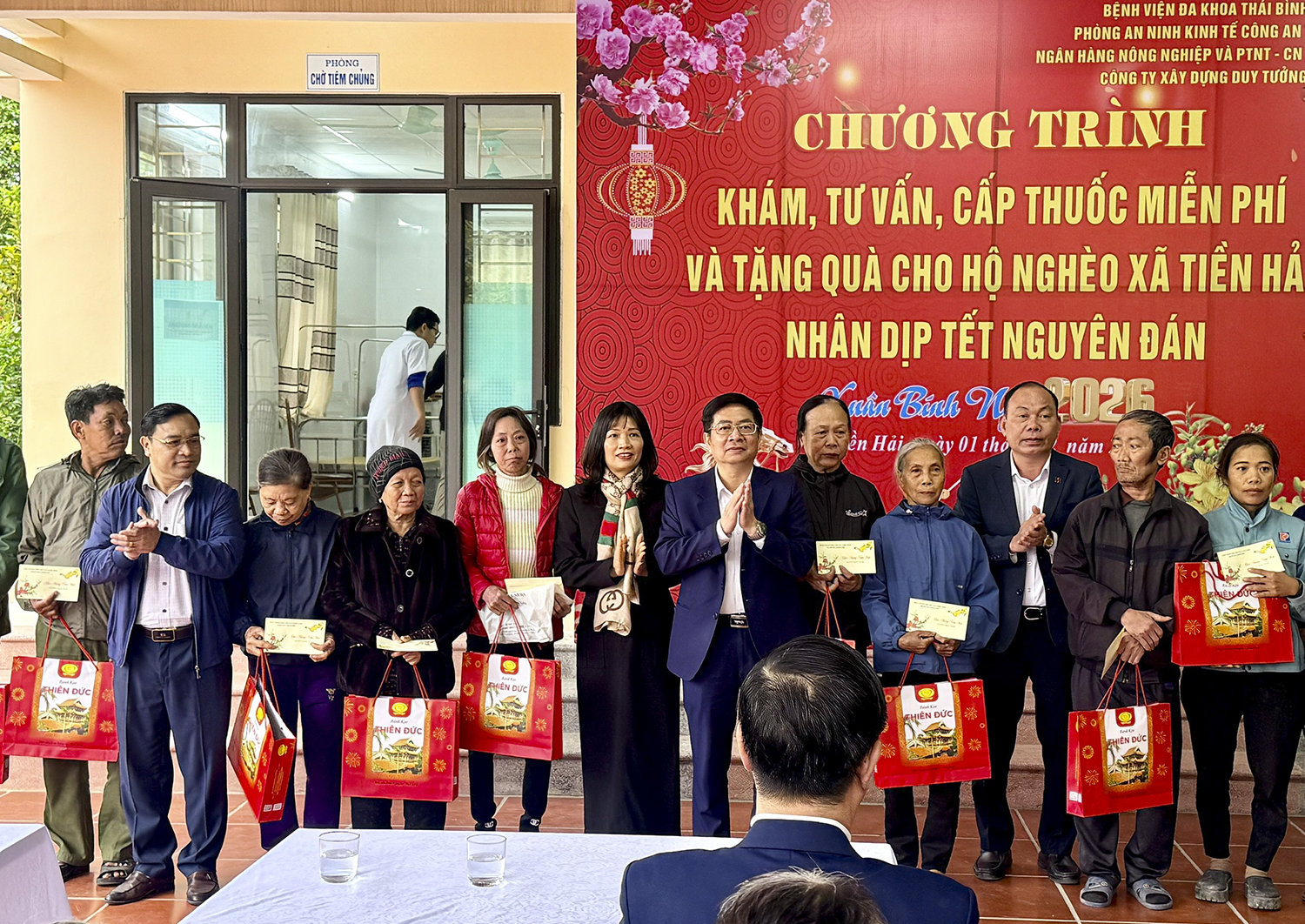 Sáng ngày 01/02/2026 tại xã Tiền Hải, tỉnh Hưng Yên, đoàn cán bộ, giảng viên và sinh viên Trường Đại học Y Dược Thái Bình đã phối hợp cùng đội ngũ y, bác sĩ Bệnh viện Đa khoa Thái Bình tổ chức chương trình khám, tư vấn sức khỏe, cấp phát thuốc miễn phí và trao quả Tết cho người dân có hoàn cảnh khó khăn trên địa bàn xã.