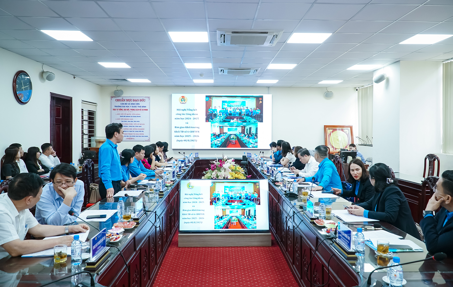 Về phía đại diện công đoàn khối thi đua số 6 có: đồng chí Trần Mạnh Hà - Chủ tịch Công đoàn Trường Đại học Y Dược Thái Bình, Khối trưởng năm học 2025-2026; cùng các đồng chí là Chủ tịch, Phó Chủ tịch, Uỷ viên Ban Thường vụ Công đoàn của 11 trường thuộc Khối thi đua số 6. Công đoàn Y tế Việt Nam: Trường Đại học Kỹ thuật Y Dược Đà Nẵng, Trường Đại học Y Dược Cần Thơ, Trường Đại học Y Hà Nội, Trường Đại học Dược Hà Nội, Học viện Y Dược học cổ truyền, Trường Đại học Y tế công cộng, Trường Đại học Y Dược Thái Bình, Trường Đại học Y Dược Hải Phòng, Trường Đại học Điều dưỡng Nam Định, Trường Đại học Kỹ thuật Y tế Hải Dương và Trường Cao đẳng Dược Trung ương Hải Dương.