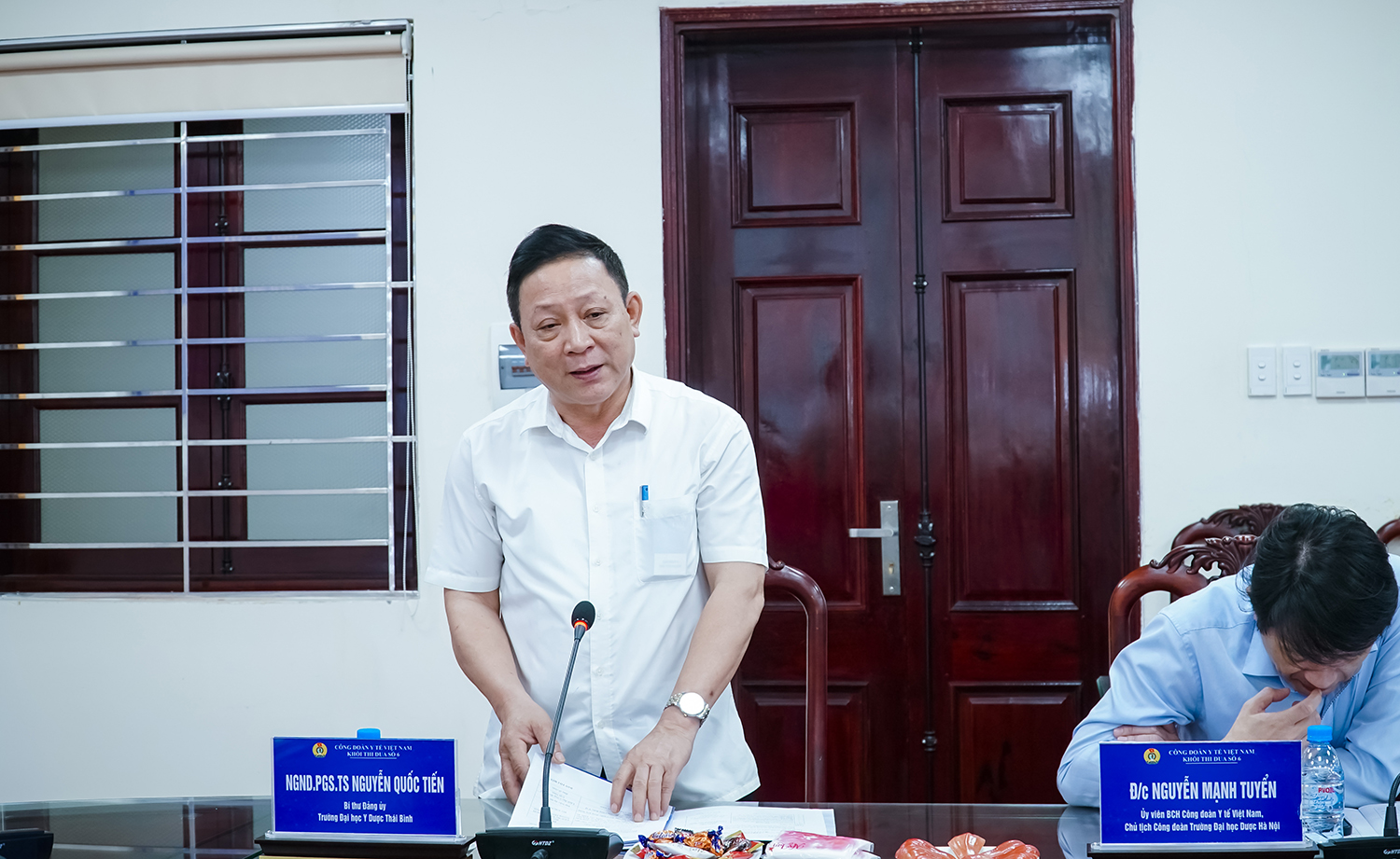 Phát biểu khai mạc Hội nghị, NGND.PGS.TS Nguyễn Quốc Tiến - Bí thư Đảng uỷ Trường Đại học Y Dược Thái Bình nhiệt liệt chào mừng các đại biểu về tham dự Hội nghị; đồng thời khẳng định đây là dịp quan trọng để các đơn vị trong Khối thi đua số 6 trao đổi kinh nghiệm, tăng cường gắn kết và phối hợp trong hoạt động công đoàn. Đồng chí cũng nhấn mạnh, trong thời gian qua, công tác công đoàn của Nhà trường đã đạt được nhiều kết quả tích cực, Nhà trường luôn quan tâm, tạo điều kiện và chăm lo đời sống vật chất, tinh thần cho cán bộ, đoàn viên, người lao động; các hoạt động công đoàn được triển khai thiết thực, hiệu quả, góp phần xây dựng môi trường làm việc đoàn kết, ổn định và phát triển.