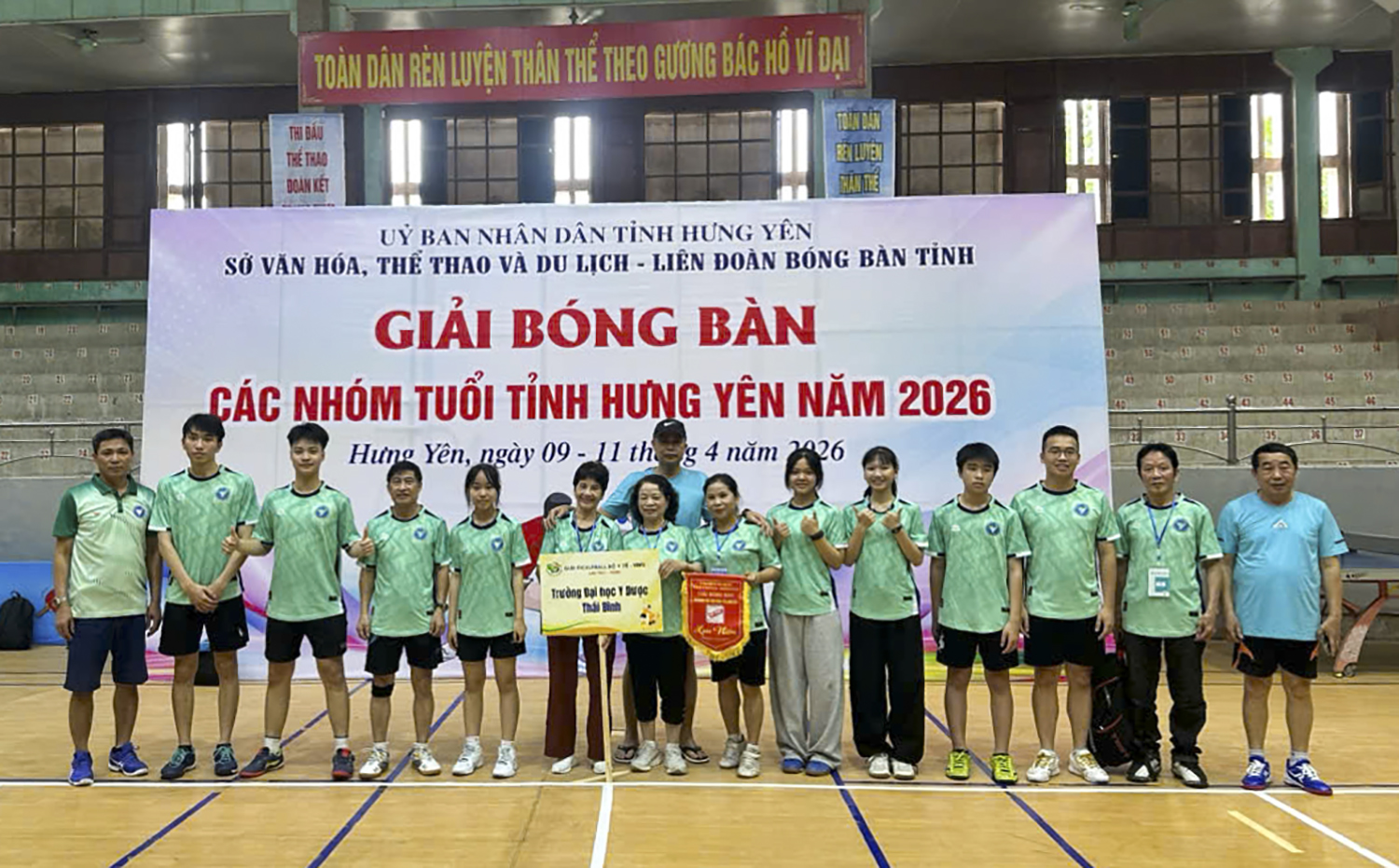 Nằm trong chuỗi các hoạt động thiết thực nhân 80 năm Ngày truyền thống ngành Thể dục thể thao Việt Nam (27/3/1946 - 27/3/2026), hướng tới kỷ niệm 51 năm Ngày Giải phóng miền Nam, thống nhất đất nước (30/4/1975 - 30/4/2026) và Ngày Quốc tế Lao động 01/5, giải bóng bàn các nhóm tuổi tỉnh Hưng Yên năm 2026 vừa được tổ chức trang trọng, quy mô tại Nhà thi đấu Hai Bà Trưng. Tham dự giải, Trường Đại học Y Dược Thái Bình đã xuất sắc giành giải nhất toàn đoàn.