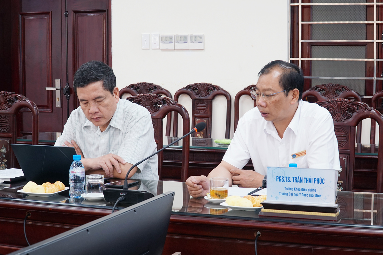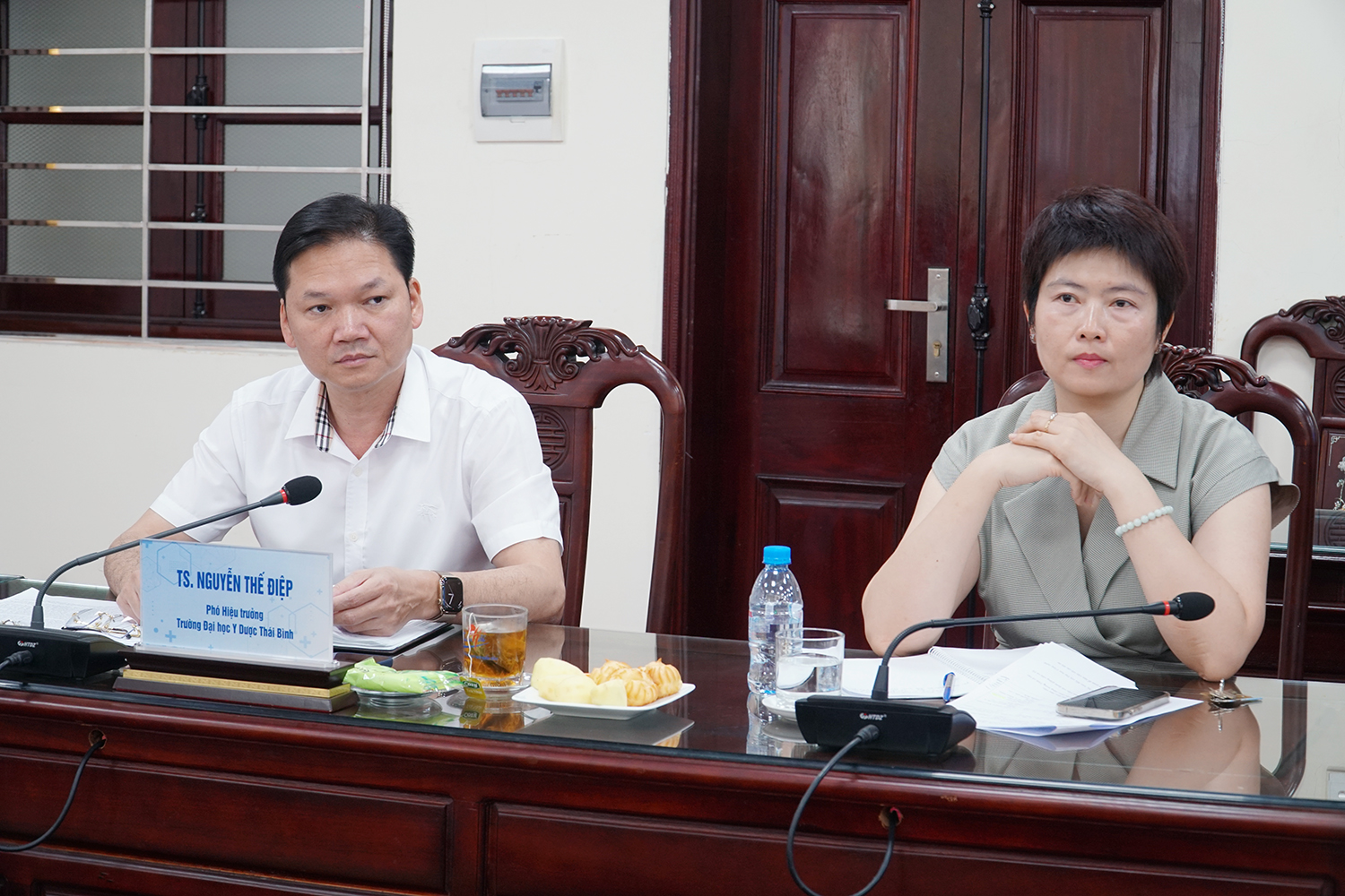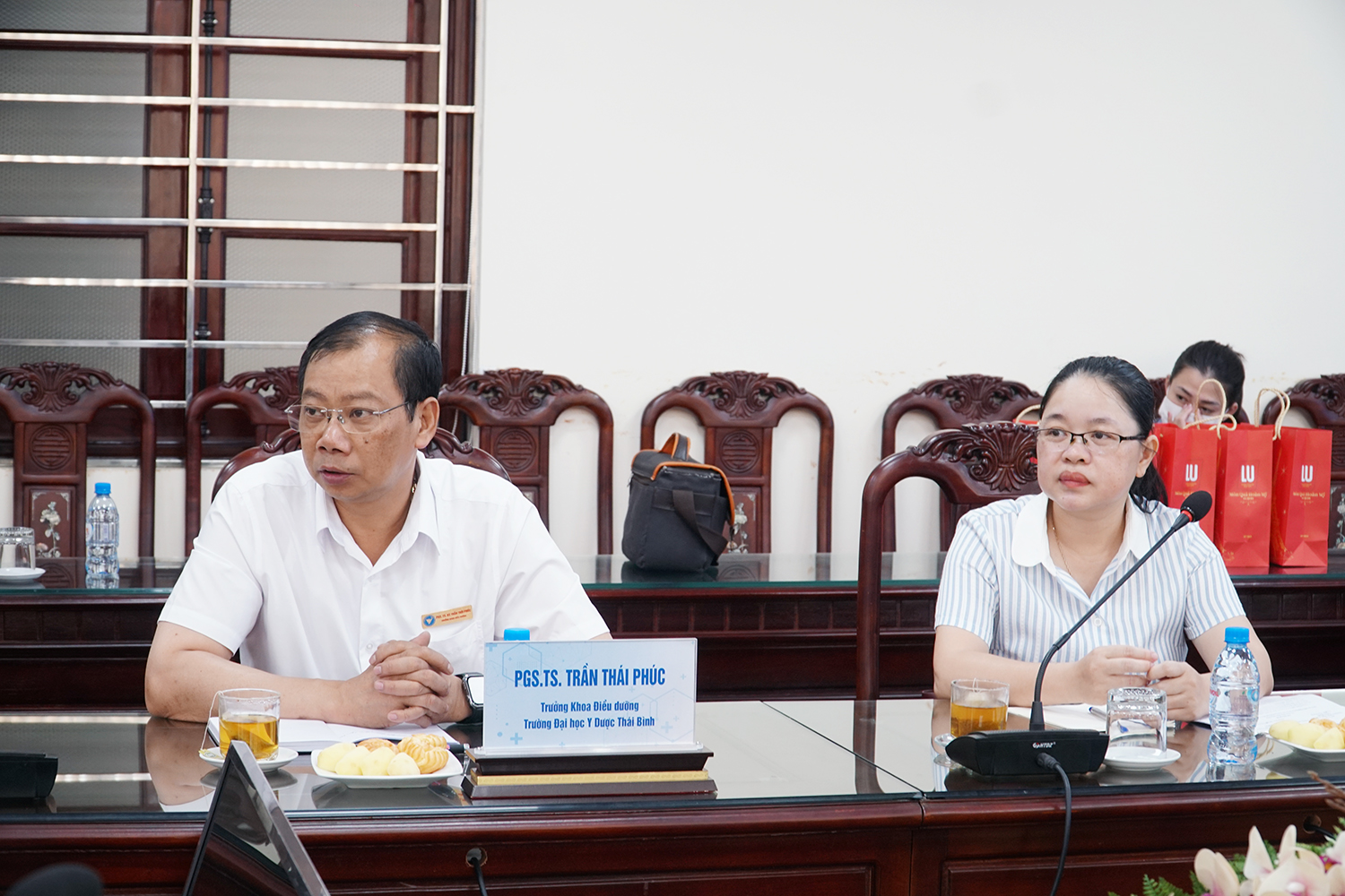 Tiếp và làm việc với đoàn, về phía Trường Đại học Y Dược Thái Bình có TS Nguyễn Thế Điệp - Phó Hiệu trưởng cùng đại diện phòng Hợp tác quốc tế; phòng Quản lý Đào tạo đại học; khoa Điều dưỡng và một số phòng, ban liên quan.