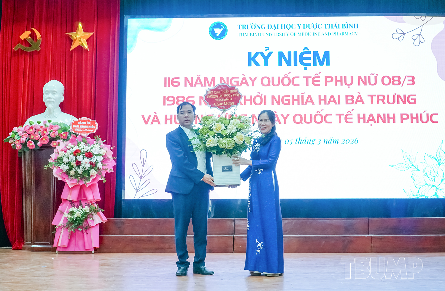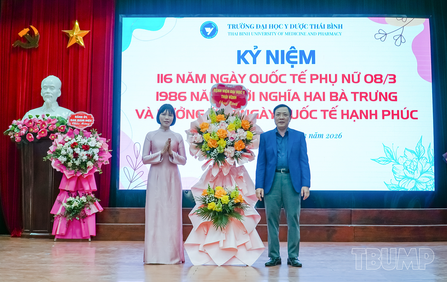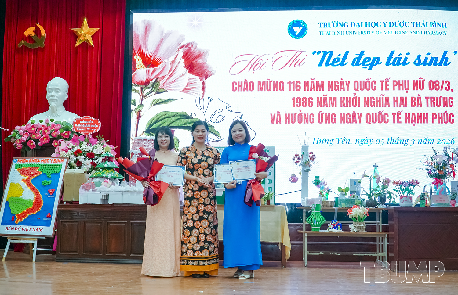 Hòa chung không khí tưng bừng của cả nước kỷ niệm 116 năm ngày quốc tế phụ nữ (8/3/1910 - 8/3/2026) và 1986 năm khởi nghĩa Hai Bà Trưng, nhằm khơi dậy và phát huy truyền thống đoàn kết yêu nước, tinh thần lao động sáng tạo của người phụ nữ Việt Nam, phát huy vai trò của nữ viên chức, người lao động Nhà trường, chiều ngày 05/3/2026, Ban Chấp hành Công đoàn và Ban Nữ công Trường Đại học Y Dược Thái Bình tổ chức chương trình kỷ niệm 116 năm ngày Quốc tế Phụ nữ, 1986 năm khởi nghĩa Hai Bà Trưng, hưởng ứng ngày Quốc tế hạnh phúc 20/3 và Hội thi “Nét đẹp tái sinh”.