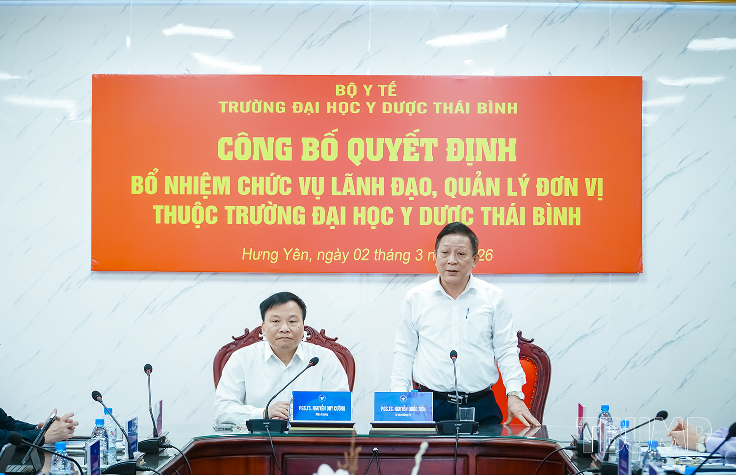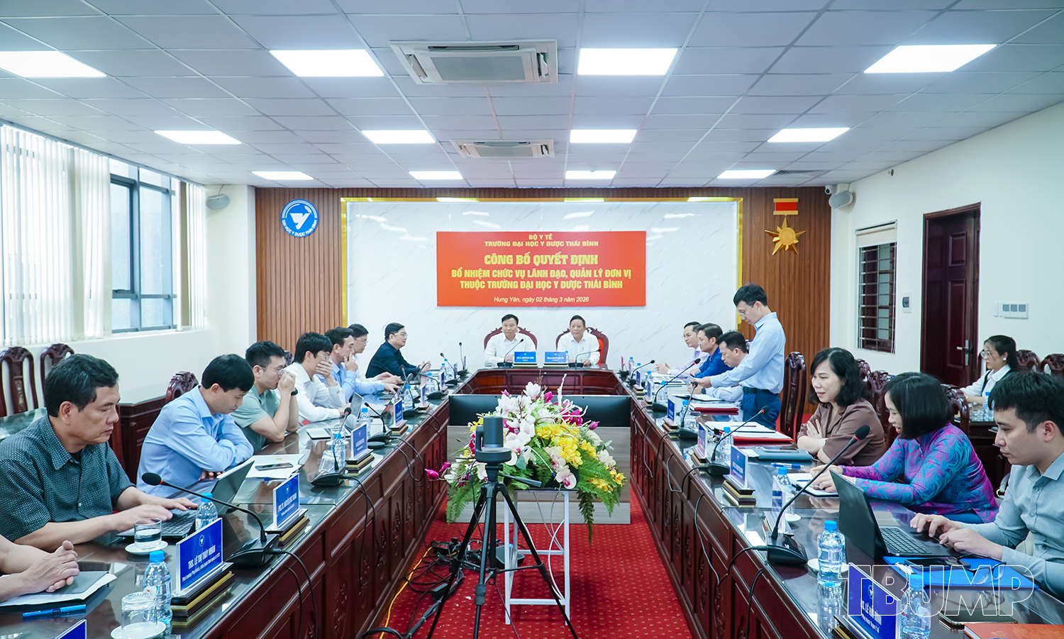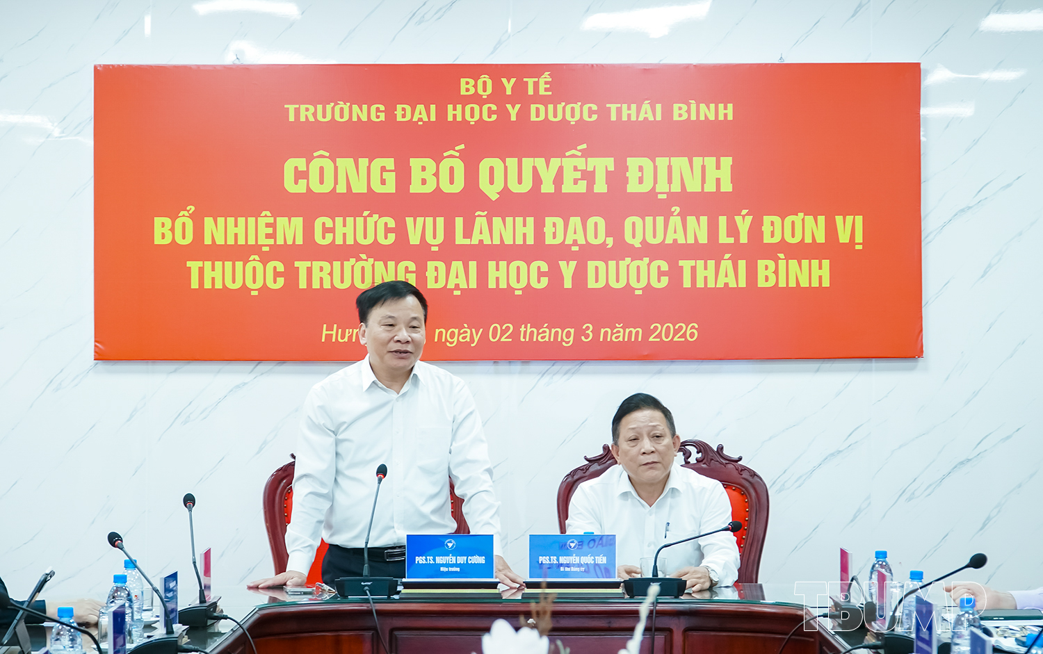 Ngày 02/03/2026, tại cuộc họp giao ban cán bộ lãnh đạo, quản lý, ThS Lê Xuân Hưng - Phó trưởng phòng Tổ chức cán bộ công bố Quyết định số 314/QĐ-YDTB bổ nhiệm TS Tăng Thị Hảo, giảng viên, phụ trách, quản lý, điều hành bộ môn Điều dưỡng Sản - Nhi, Khoa Điều dưỡng giữ chức vụ Phó trưởng Bộ môn Điều dưỡng Sản - Nhi, Khoa Điều dưỡng; Quyết định số 315/QĐ-YDTB, bổ nhiệm TS Phạm Thị Nga, giảng viên, phụ trách, quản lý, điều hành Bộ môn Điều dưỡng cơ bản và Quản lý điều dưỡng, Khoa Điều dưỡng giữ chức vụ Phó trưởng Bộ môn Điều dưỡng cơ bản và Quản lý điều dưỡng, Khoa Điều dưỡng;