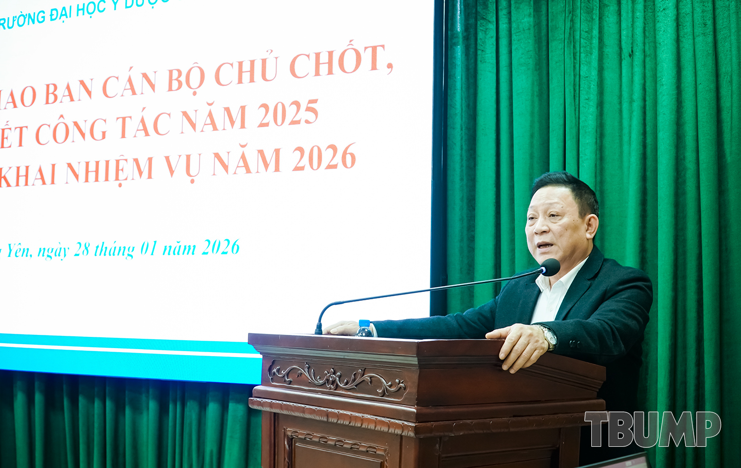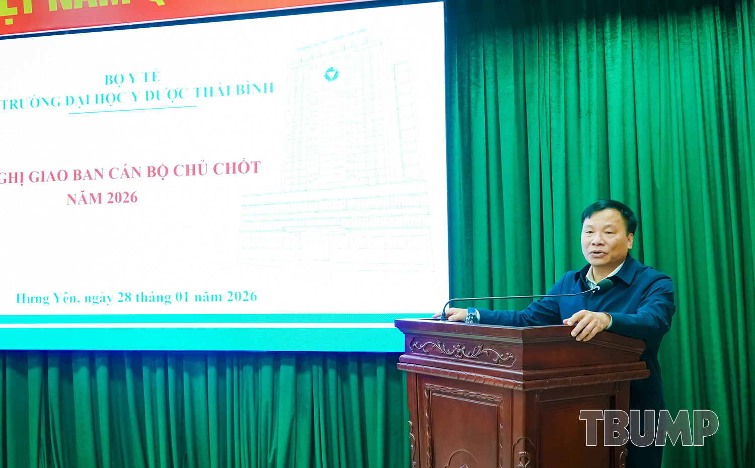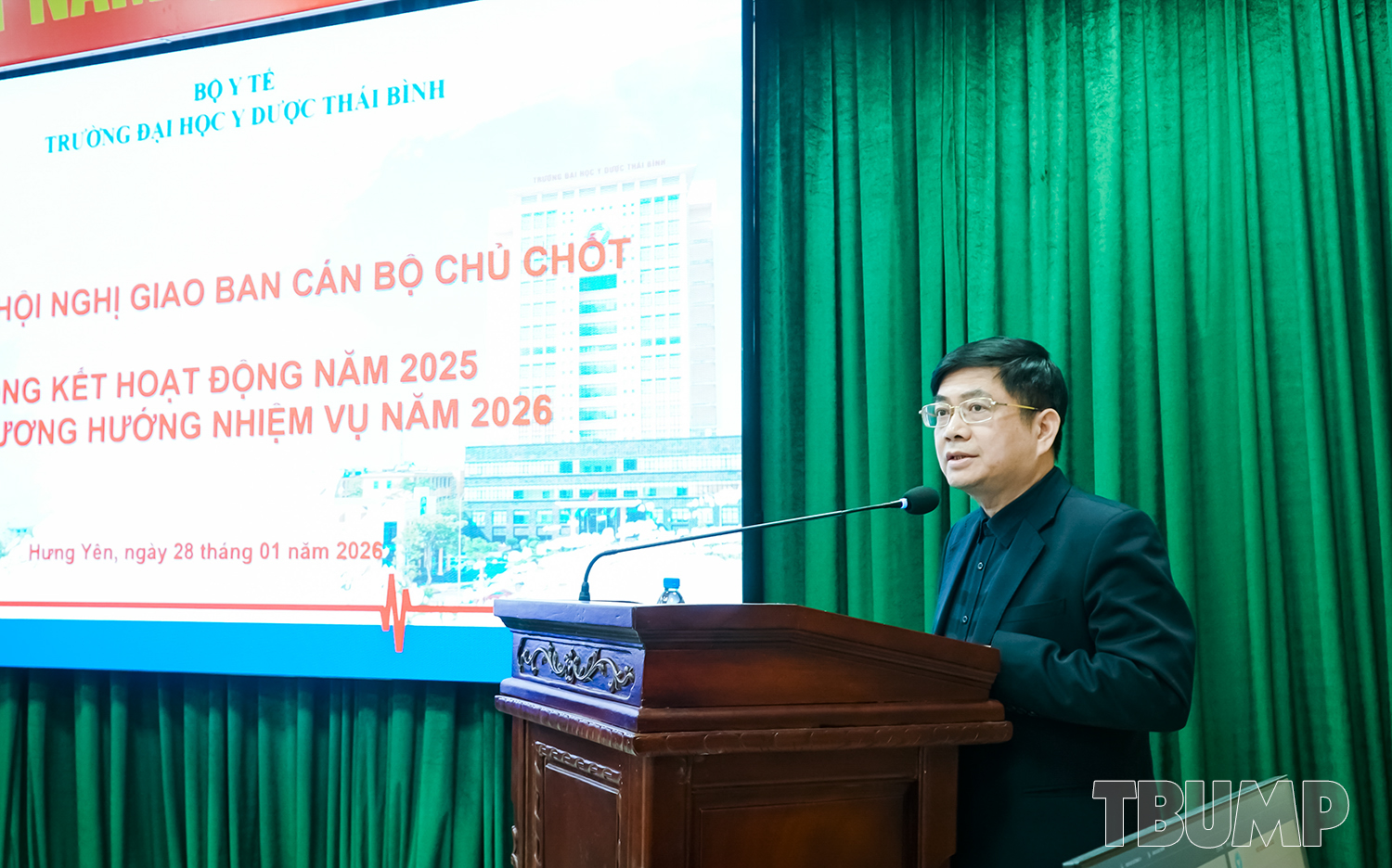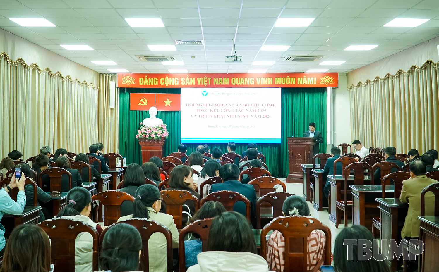 Ngày 28/01/2026, Trường Đại học Y Dược Thái Bình đã tổ chức Hội nghị giao ban cán bộ chủ chốt, tổng kết công tác năm 2025 và triển khai phương hướng, nhiệm vụ trọng tâm năm 2026. Hội nghị được tổ chức thường niên nhằm đánh giá toàn diện kết quả thực hiện các mặt công tác năm 2025, đồng thời xác định phương hướng, nhiệm vụ trọng tâm năm 2026.