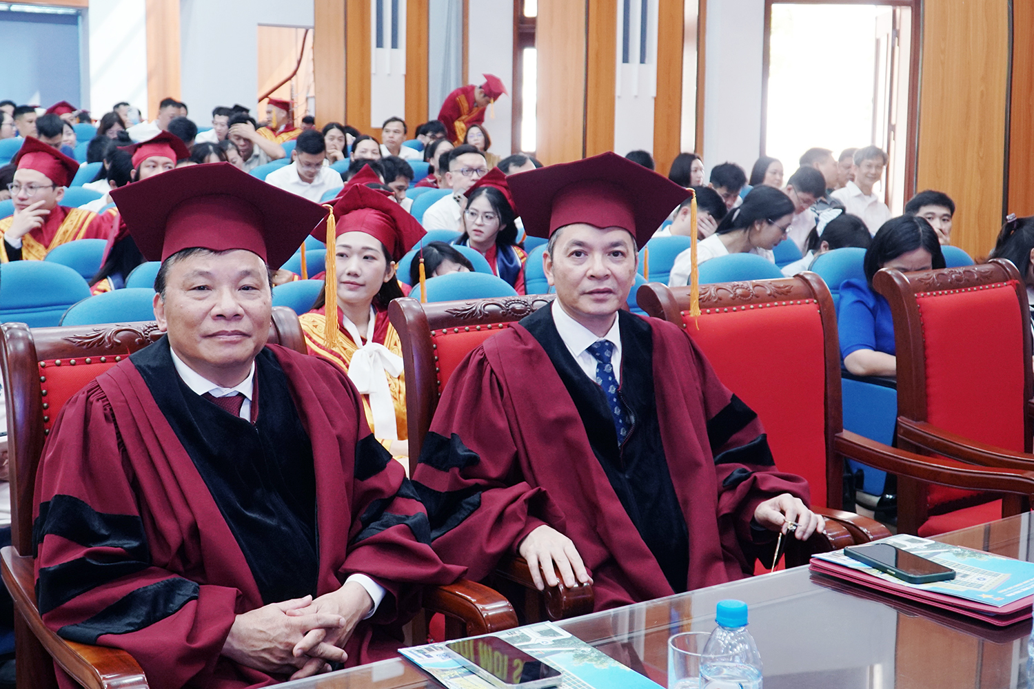 PGS.TS Nguyễn Quốc Tiến - Bí thư Đảng ủy và PGS.TS Nguyễn Duy Cường - Hiệu trưởng Nhà trường trao bằng tốt nghiệp cho tân Tiến sĩ.