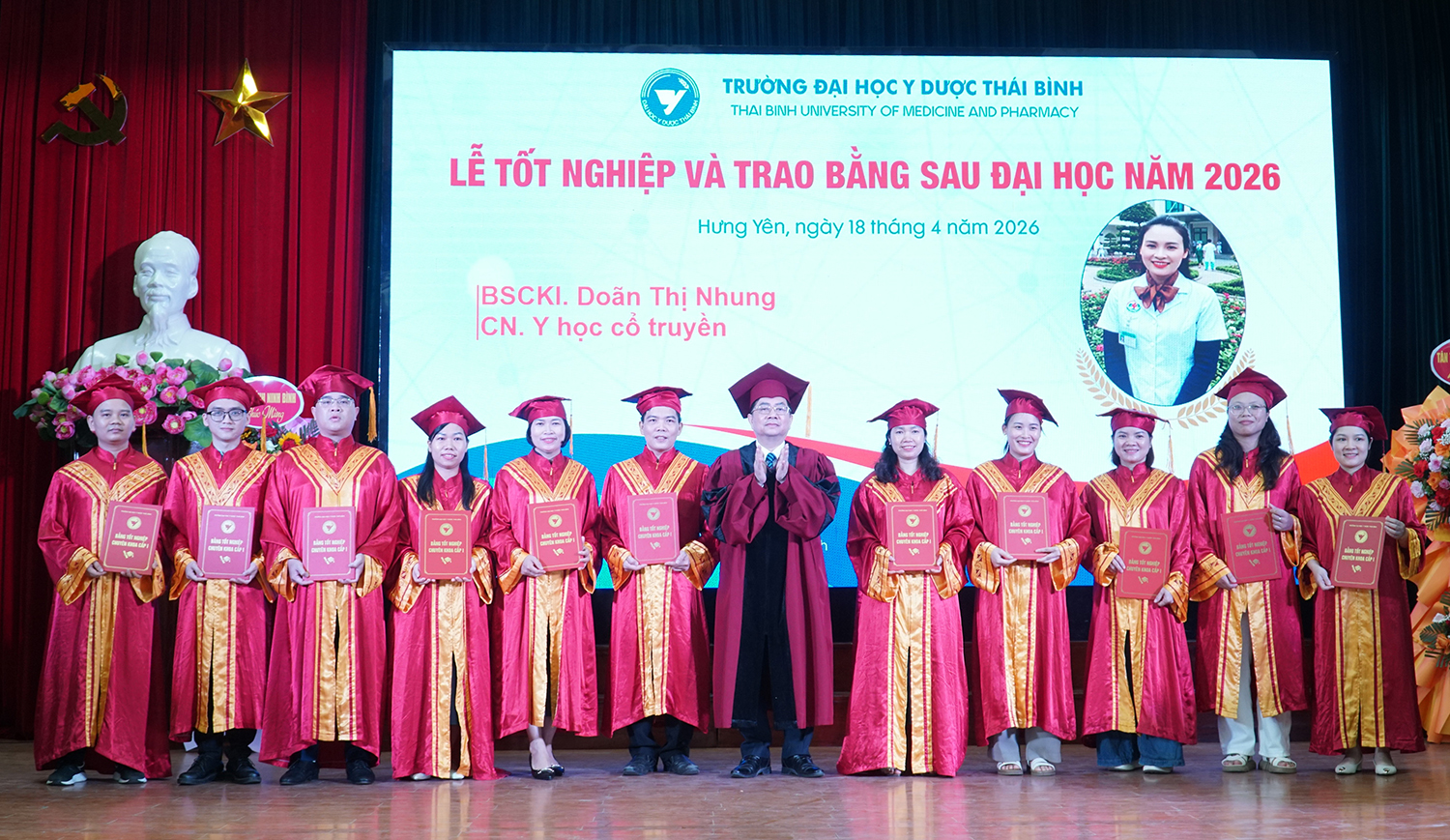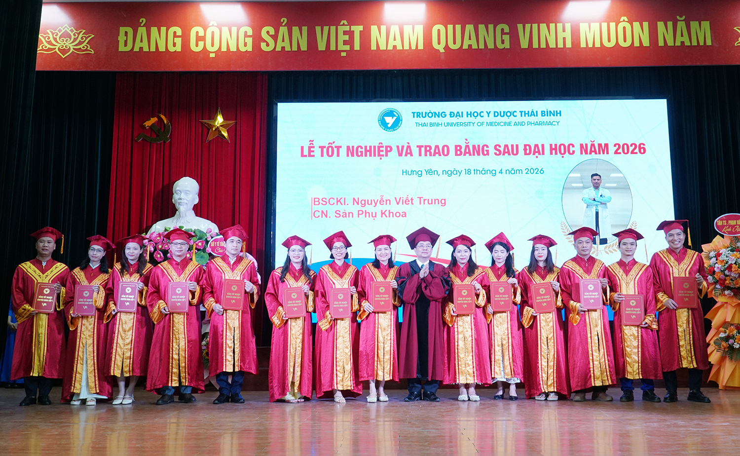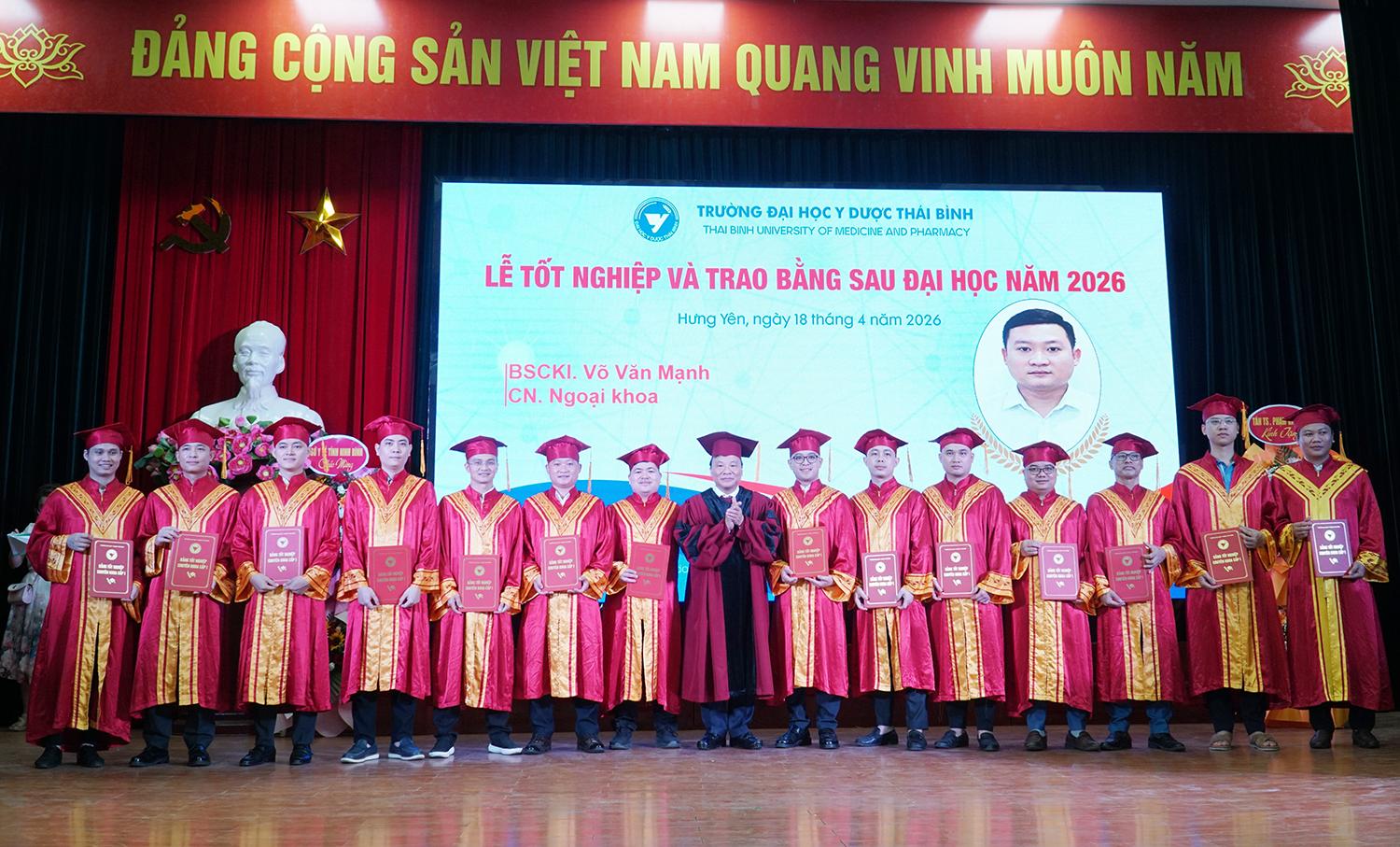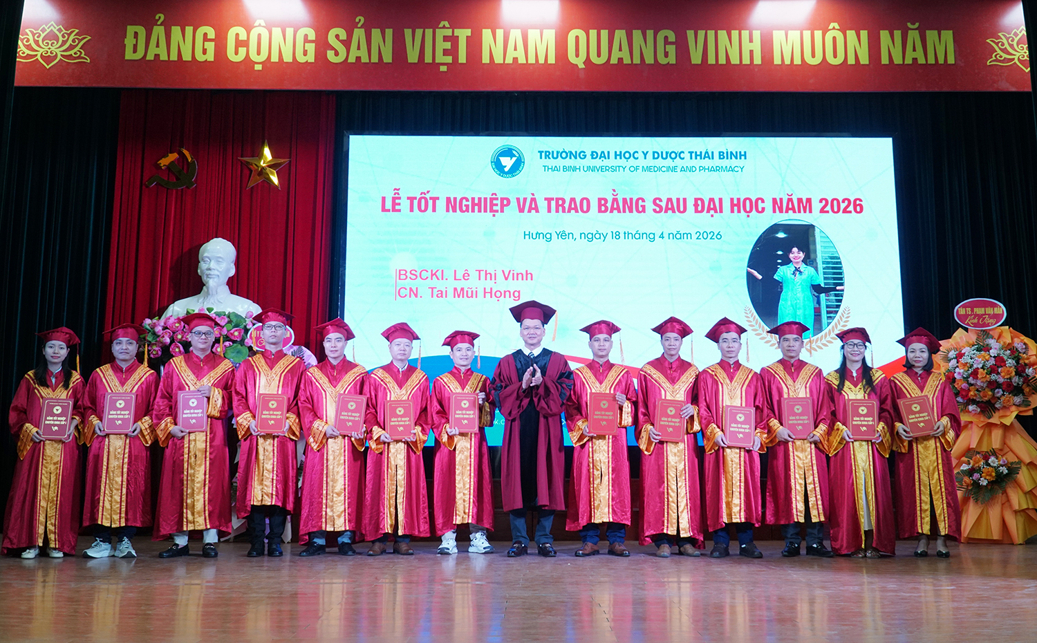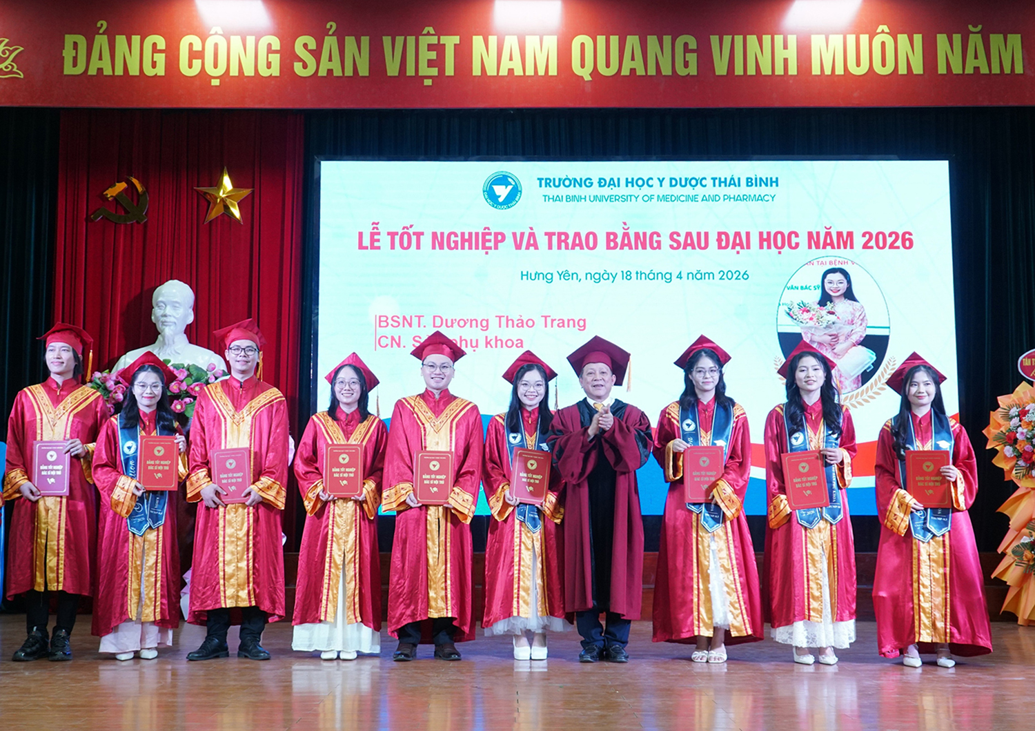 Lễ tốt nghiệp và trao bằng sau đại học năm 2026 không chỉ ghi nhận thành quả học tập của các nghiên cứu sinh, học viên, mà còn tiếp tục khẳng định vai trò đầu tàu của Trường Đại học Y Dược Thái Bình trong đào tạo sau đại học ngành y tế. Với bề dày truyền thống, quy mô đào tạo lớn và không ngừng nâng cao chất lượng, Trường Đại học Y Dược Thái Bình đã, đang và sẽ tiếp tục là địa chỉ tin cậy trong đào tạo nguồn nhân lực chất lượng cao, đáp ứng yêu cầu phát triển của ngành y tế Việt Nam trong giai đoạn mới./.